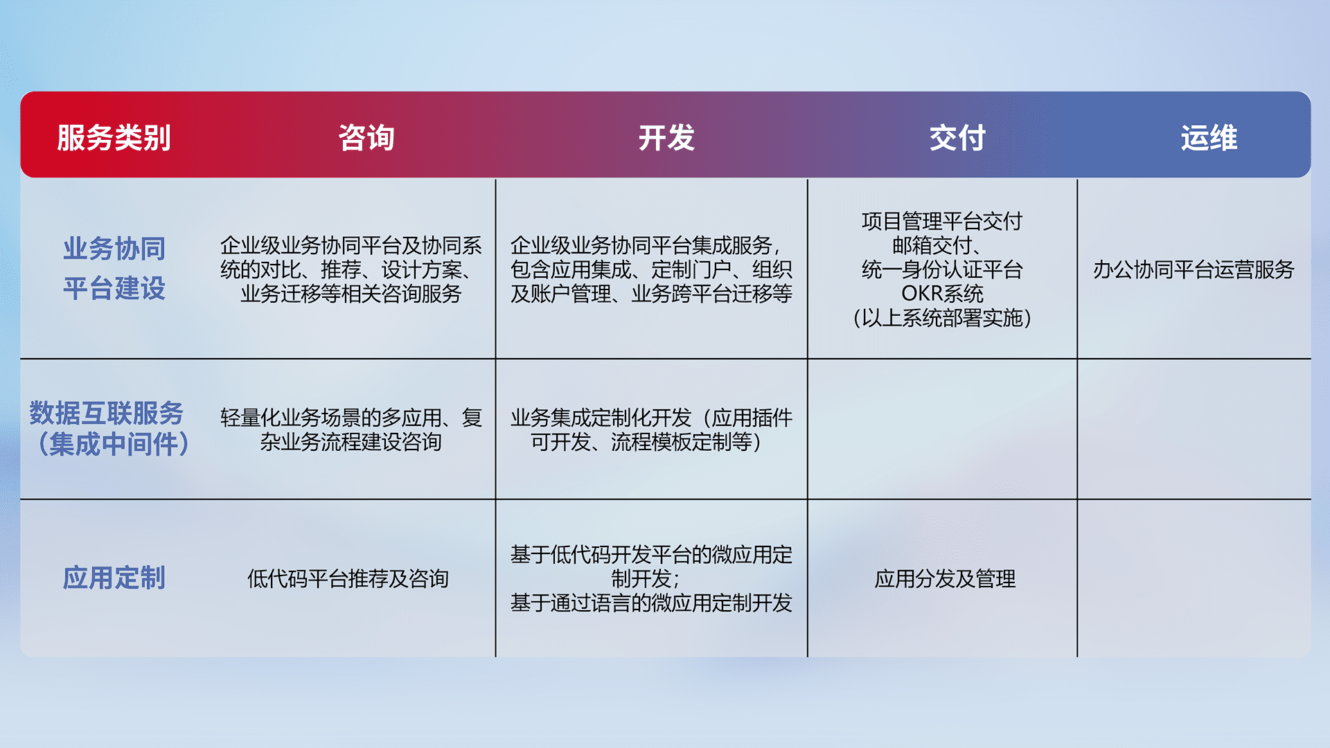 针对钉钉、、、、企微、、IDaas等平台级产品提供产品的规划、、、、方案、、、交付、、定制化开发等服务,,,,实现如统一协同办公、、、、智能客户服务、、、混合会议管理、、、、智能数据查询、、、等业务场景,,,实现数字化转型。。。。