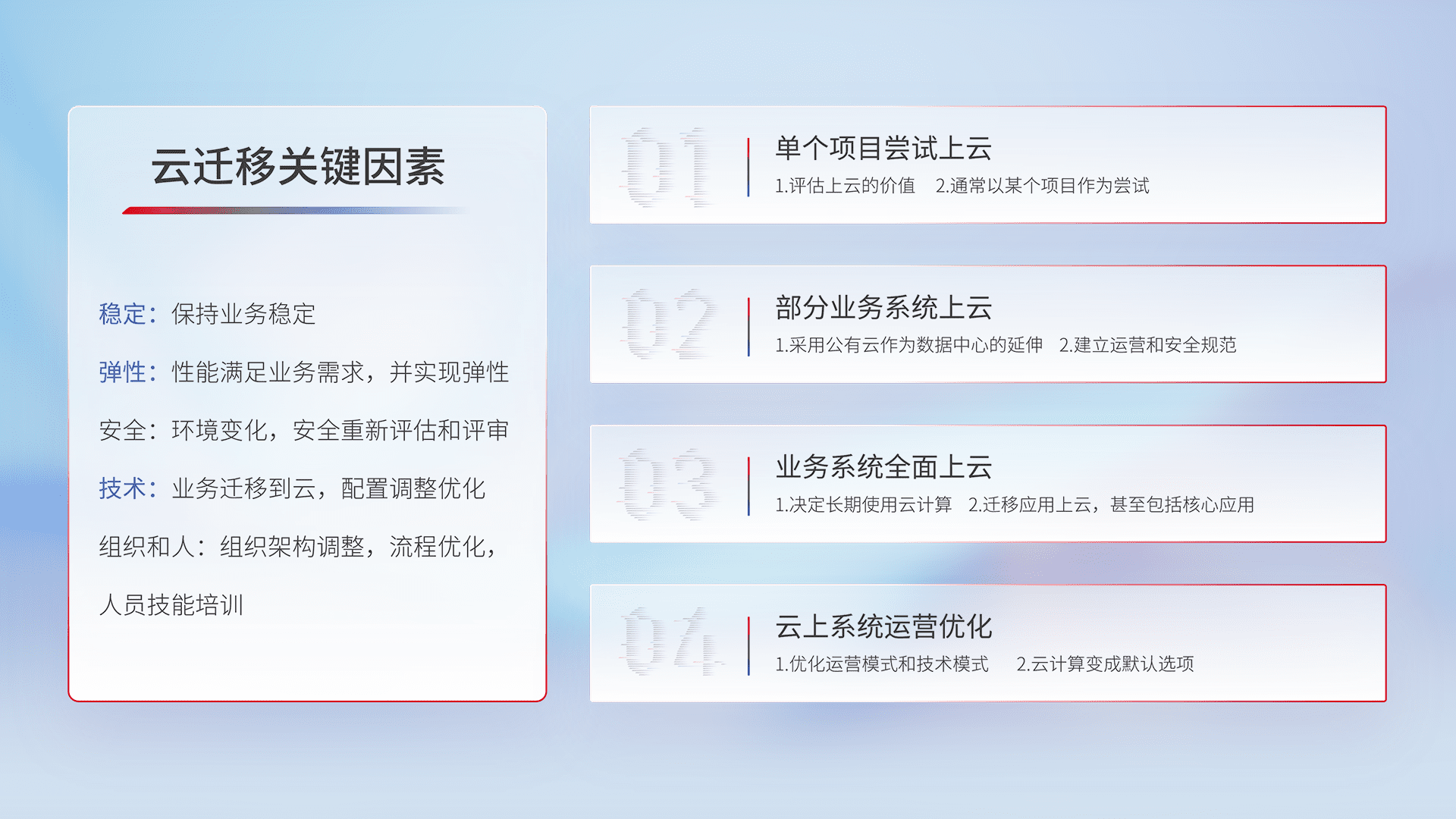 结合实际业务,,,从规划设计、、云平台选型、、、、云原生改造、、、数据迁移、、、集成交付,,,迁移全过程为客户识别最佳上云路径,,做好风险识别管理,,设计网络架构、、、、身份权限、、、、安全审计合规、、、、操作审计、、、、日志审计、、、监控告警策略、、、、多站点容灾设计等,,,对云上基础设施进行整体规划,,,,提升IT治理水平,,,,以满足弹性、、、高可用、、高性能的需求。。