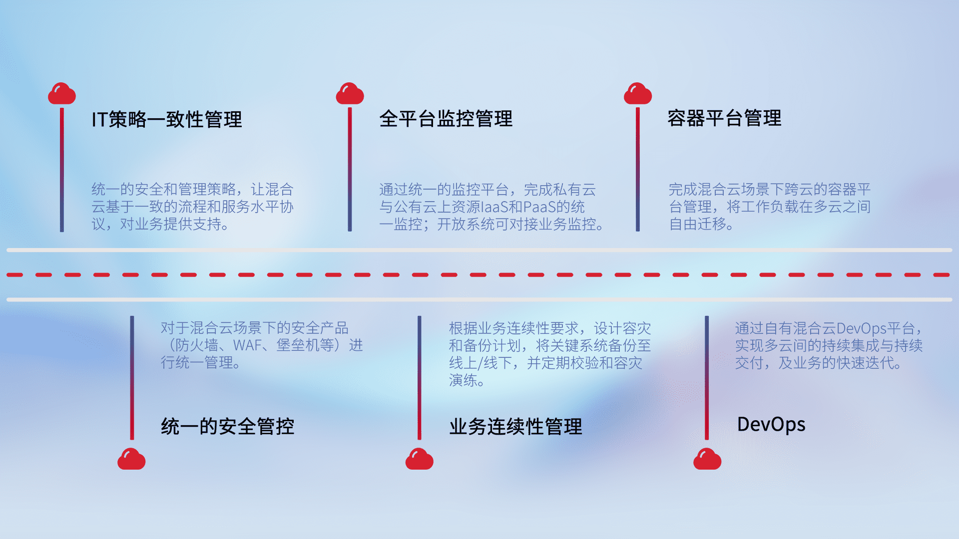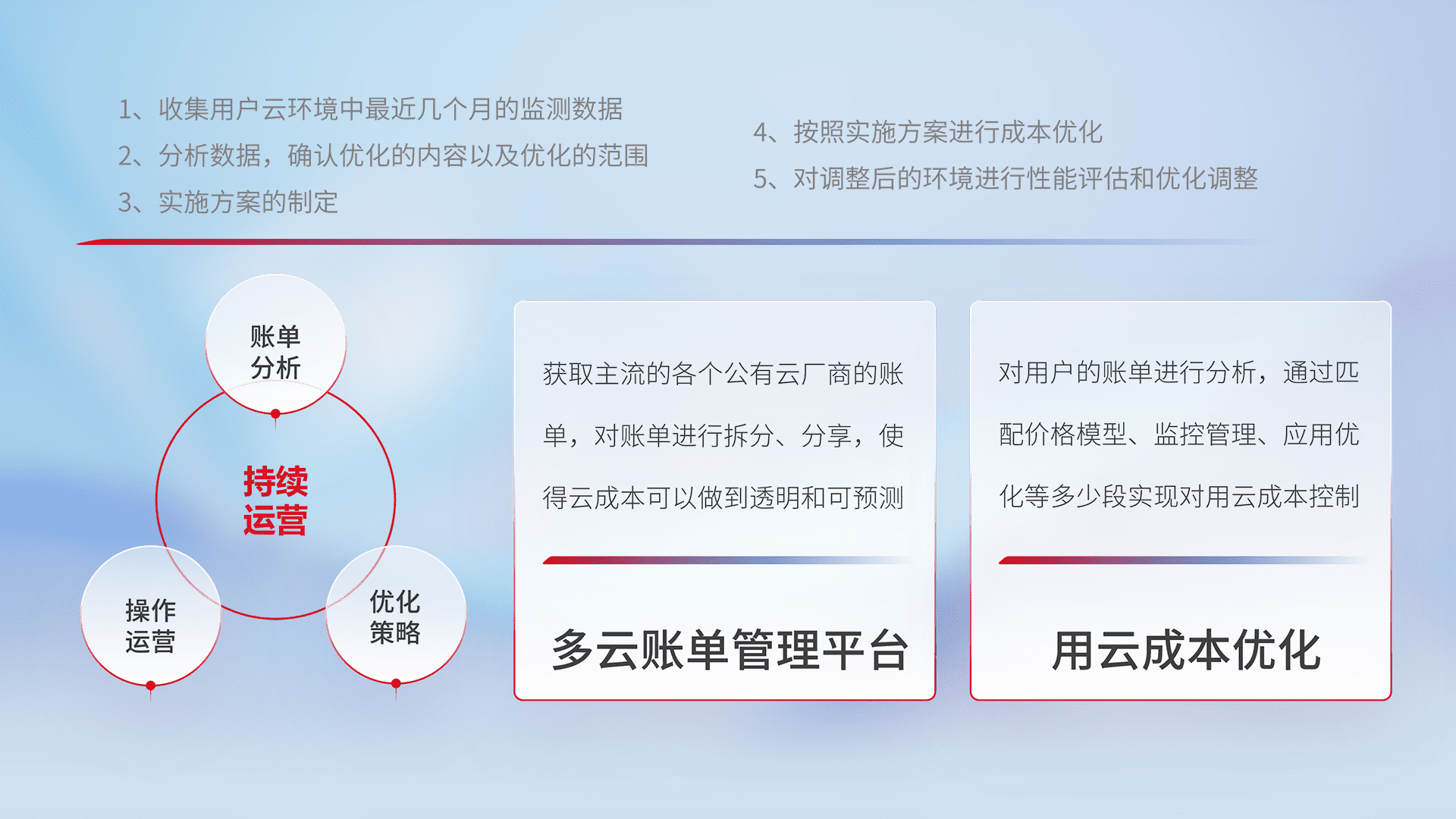 通过多云纳管,,以统一的资源数据模型把客户的云资源进行抽象和封装,,,进而实现对多云资源的统一操作,,,,保障云资源管理的可靠性、、稳定性与可用性。。量身定制化运维内容,,,,配置、、、开发运维、、、补丁管理、、、、备份、、、、监控、、、、认证和访问管理、、、、审计和日常巡检等,,保障在用云过程中的可靠度,,,稳定度以及高可用率。。。。