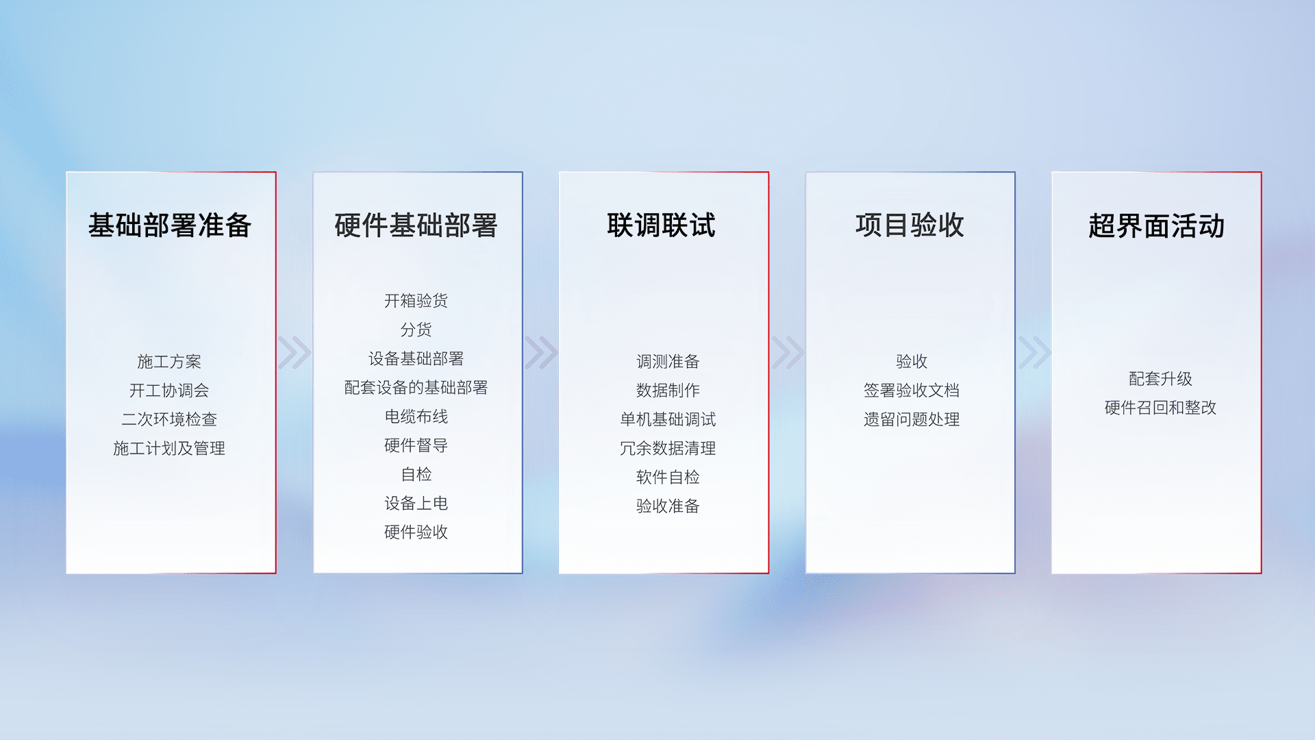 从基础部署准备、、、、硬件基础部署、、、联调联试、、、项目验收、、、越界面活动的全过程可追溯,,保证施工质量和进度。。